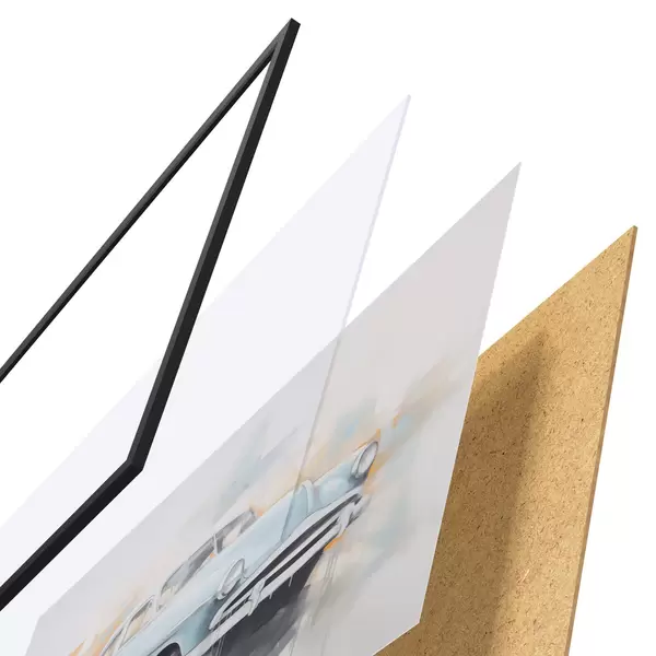 Das Poster besteht aus einem Rahmen, Plexiglas, einem gedruckten Bild und einer Rückwand aus Spanplatten. Dank der Halterungen auf der Rückseite kann das Poster sofort an die Wand gehängt werden.