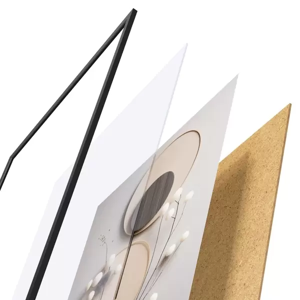 Das Poster besteht aus einem Rahmen, Plexiglas, einem gedruckten Bild und einer Rückwand aus Spanplatten. Dank der Halterungen auf der Rückseite kann das Poster sofort an die Wand gehängt werden.