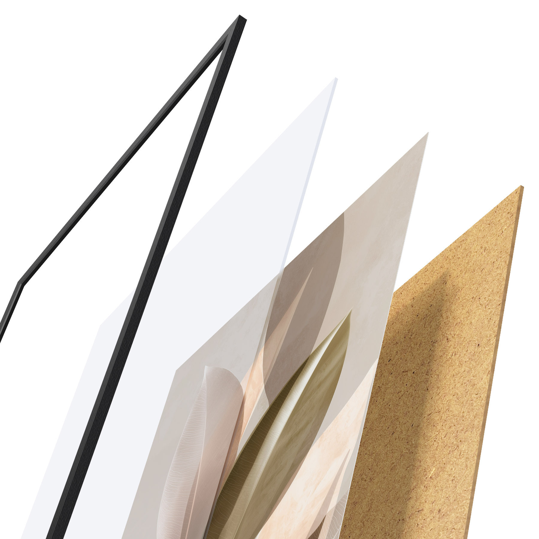 Das Poster besteht aus einem Rahmen, Plexiglas, einem gedruckten Bild und einer Rückwand aus Spanplatten. Dank der Halterungen auf der Rückseite kann das Poster sofort an die Wand gehängt werden.