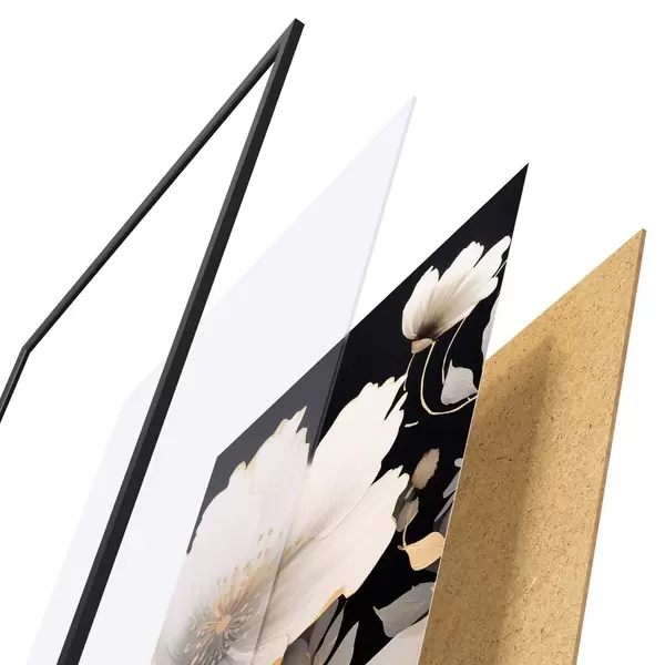 Das Poster besteht aus einem Rahmen, Plexiglas, einem gedruckten Bild und einer Rückwand aus Spanplatten. Dank der Halterungen auf der Rückseite kann das Poster sofort an die Wand gehängt werden.