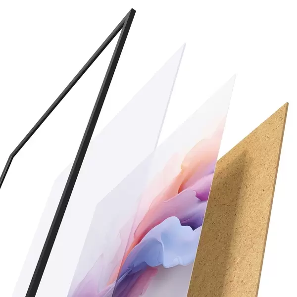 Das Poster besteht aus einem Rahmen, Plexiglas, einem gedruckten Bild und einer Rückwand aus Spanplatten. Dank der Halterungen auf der Rückseite kann das Poster sofort an die Wand gehängt werden.