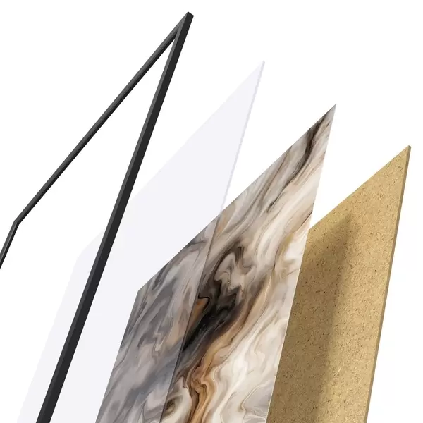 Das Poster besteht aus einem Rahmen, Plexiglas, einem gedruckten Bild und einer Rückwand aus Spanplatten. Dank der Halterungen auf der Rückseite kann das Poster sofort an die Wand gehängt werden.