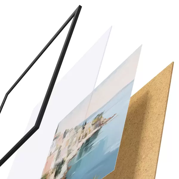 Das Poster besteht aus einem Rahmen, Plexiglas, einem gedruckten Bild und einer Rückwand aus Spanplatten. Dank der Halterungen auf der Rückseite kann das Poster sofort an die Wand gehängt werden.