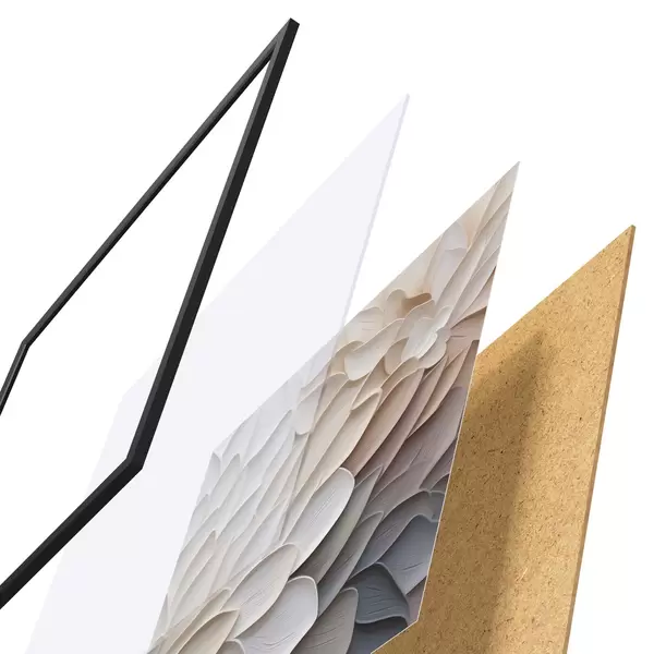 Das Poster besteht aus einem Rahmen, Plexiglas, einem gedruckten Bild und einer Rückwand aus Spanplatten. Dank der Halterungen auf der Rückseite kann das Poster sofort an die Wand gehängt werden.
