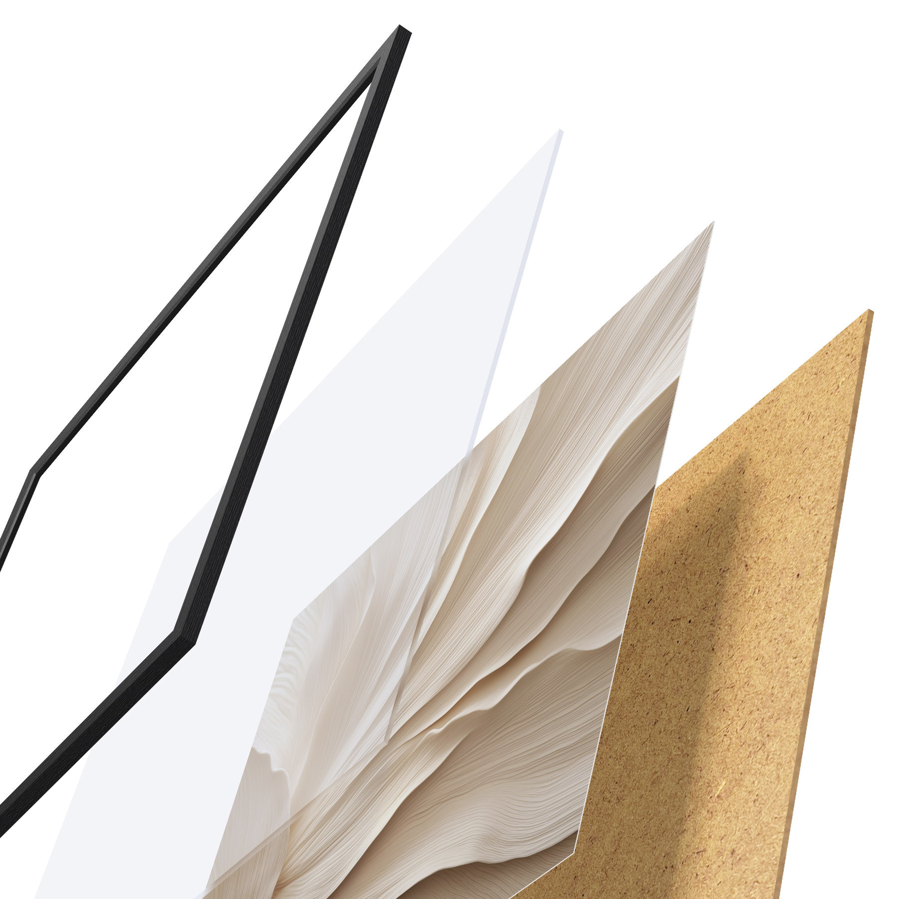 Das Poster besteht aus einem Rahmen, Plexiglas, einem gedruckten Bild und einer Rückwand aus Spanplatten. Dank der Halterungen auf der Rückseite kann das Poster sofort an die Wand gehängt werden.
