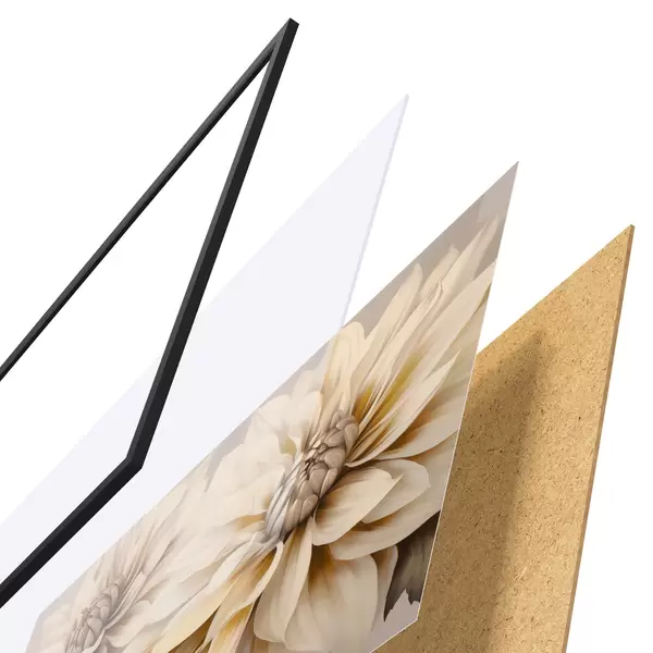 Das Poster besteht aus einem Rahmen, Plexiglas, einem gedruckten Bild und einer Rückwand aus Spanplatten. Dank der Halterungen auf der Rückseite kann das Poster sofort an die Wand gehängt werden.