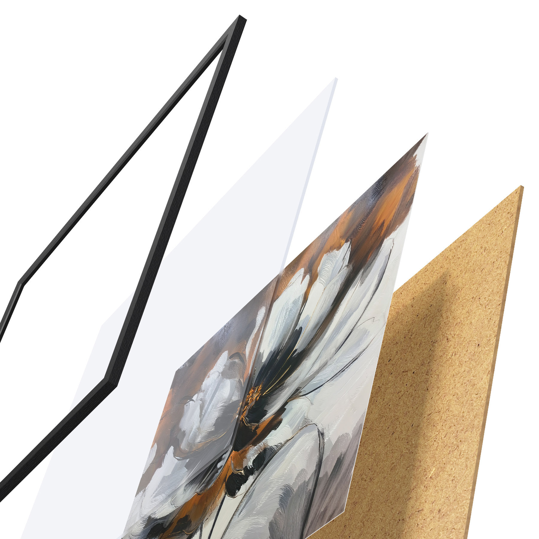 Das Poster besteht aus einem Rahmen, Plexiglas, einem gedruckten Bild und einer Rückwand aus Spanplatten. Dank der Halterungen auf der Rückseite kann das Poster sofort an die Wand gehängt werden.