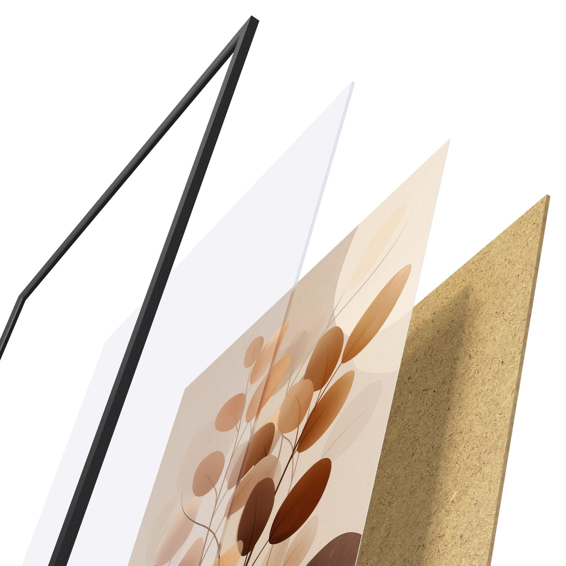 Das Poster besteht aus einem Rahmen, Plexiglas, einem gedruckten Bild und einer Rückwand aus Spanplatten. Dank der Halterungen auf der Rückseite kann das Poster sofort an die Wand gehängt werden.