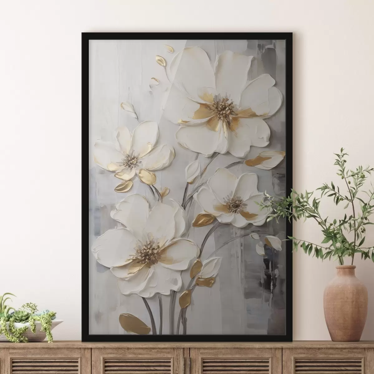 Poster Weiße Blumen mit gelben Akzenten auf einem strukturierten Hintergrund f48721