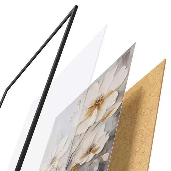 Das Poster besteht aus einem Rahmen, Plexiglas, einem gedruckten Bild und einer Rückwand aus Spanplatten. Dank der Halterungen auf der Rückseite kann das Poster sofort an die Wand gehängt werden.