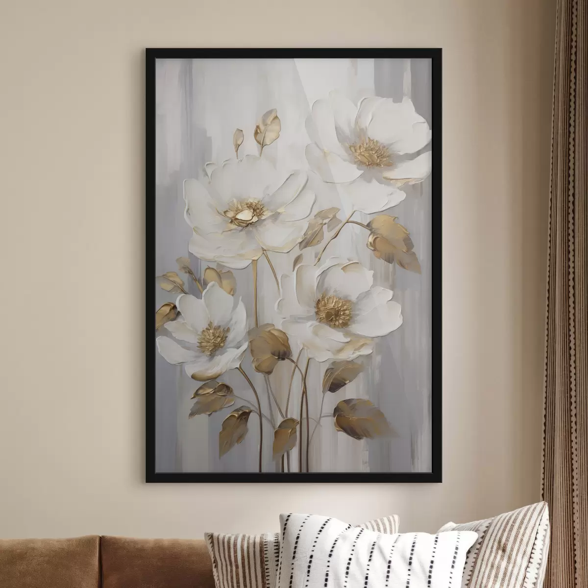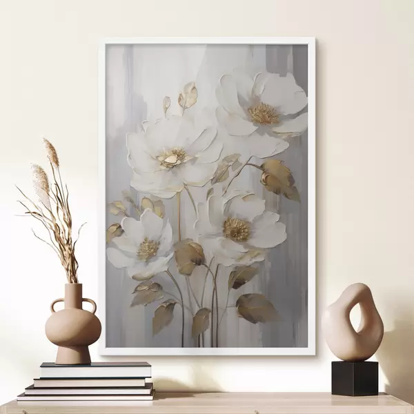 Poster Weiße Blumen mit gelben Akzenten auf einem strukturierten Hintergrund f48722