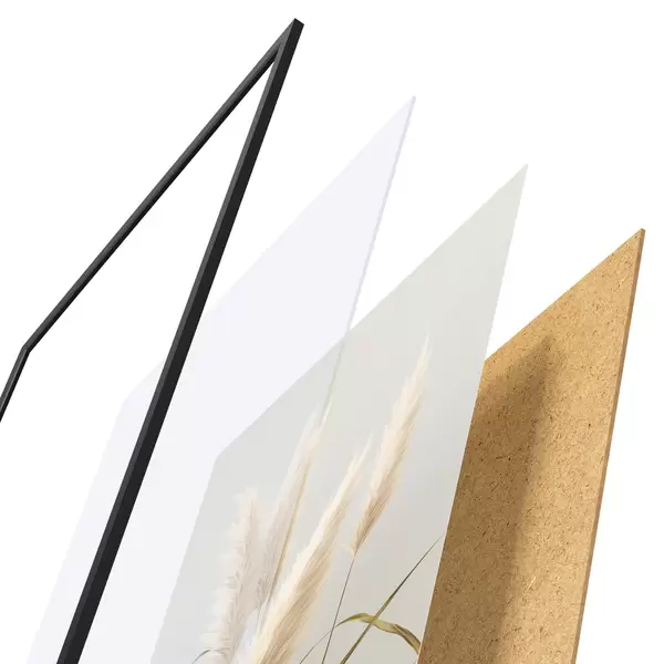Das Poster besteht aus einem Rahmen, Plexiglas, einem gedruckten Bild und einer Rückwand aus Spanplatten. Dank der Halterungen auf der Rückseite kann das Poster sofort an die Wand gehängt werden.