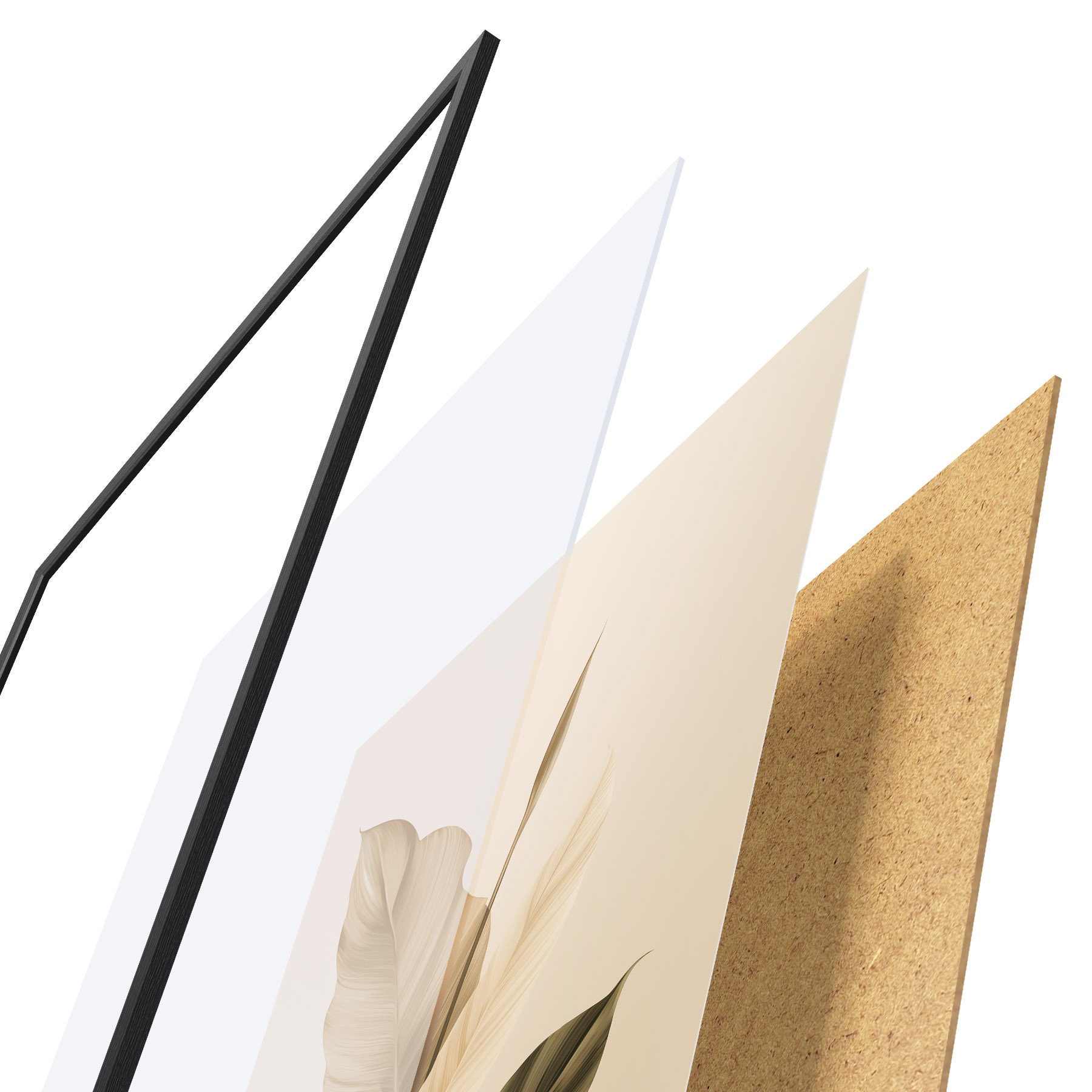 Das Poster besteht aus einem Rahmen, Plexiglas, einem gedruckten Bild und einer Rückwand aus Spanplatten. Dank der Halterungen auf der Rückseite kann das Poster sofort an die Wand gehängt werden.
