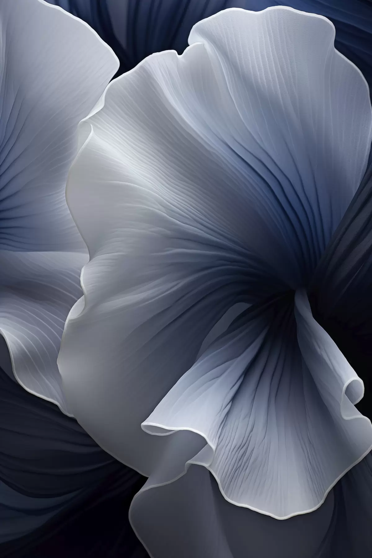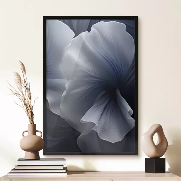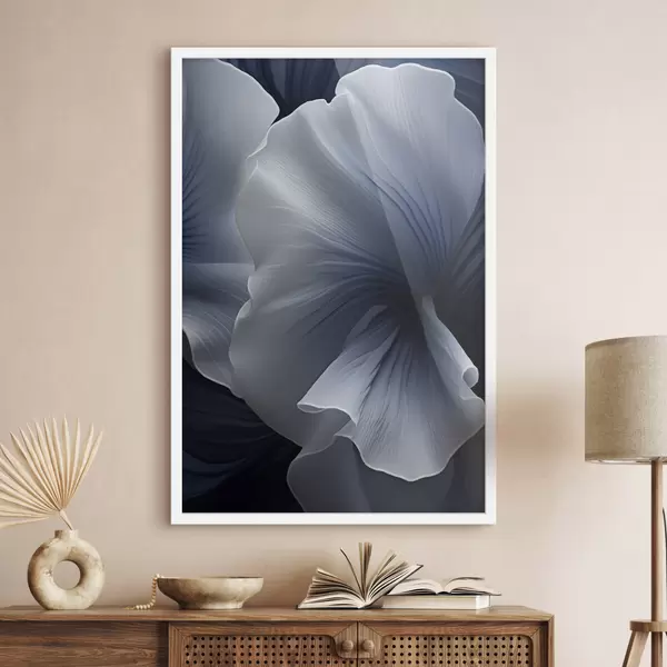 Poster Abstrakte blau-weiße Blütenblätter vor dunklem Hintergrund Nr f48731