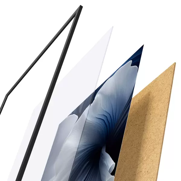 Das Poster besteht aus einem Rahmen, Plexiglas, einem gedruckten Bild und einer Rückwand aus Spanplatten. Dank der Halterungen auf der Rückseite kann das Poster sofort an die Wand gehängt werden.