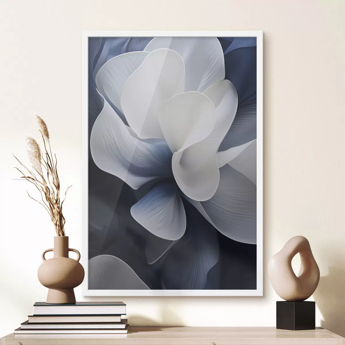 Poster Abstrakte blau-weiße Blütenblätter vor dunklem Hintergrund Nr f48732