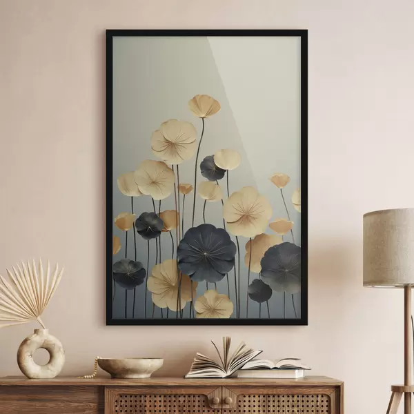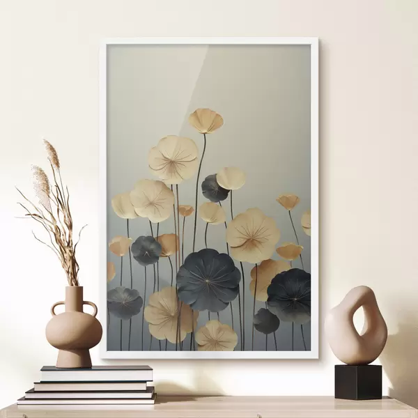 Poster Seerosenblätter vor einem gedämpften Hintergrund aus Beige und Dunkelblau f48734