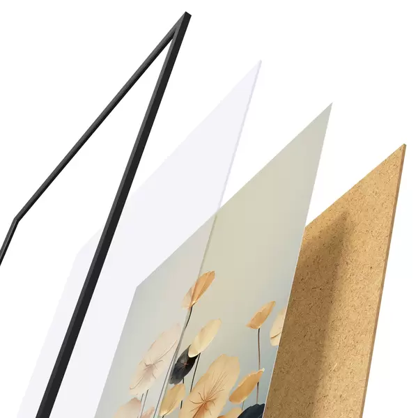 Das Poster besteht aus einem Rahmen, Plexiglas, einem gedruckten Bild und einer Rückwand aus Spanplatten. Dank der Halterungen auf der Rückseite kann das Poster sofort an die Wand gehängt werden.