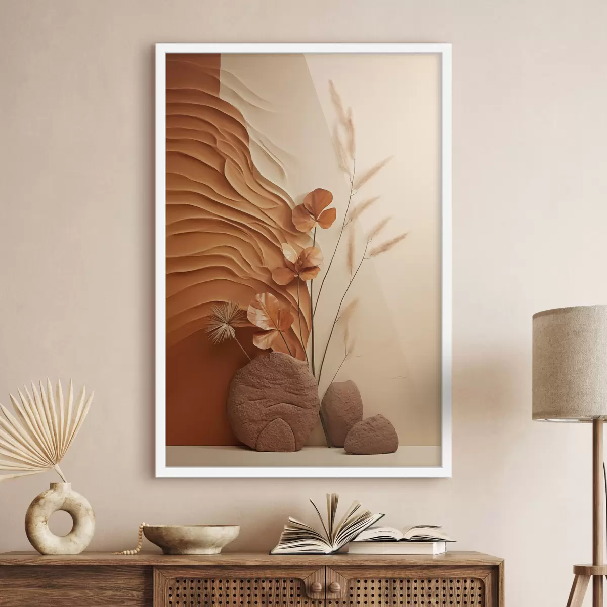 Poster Ein minimalistisches Kunstwerk mit Trockenblumen und Pampasgras, strukturierter Hintergrund f48739