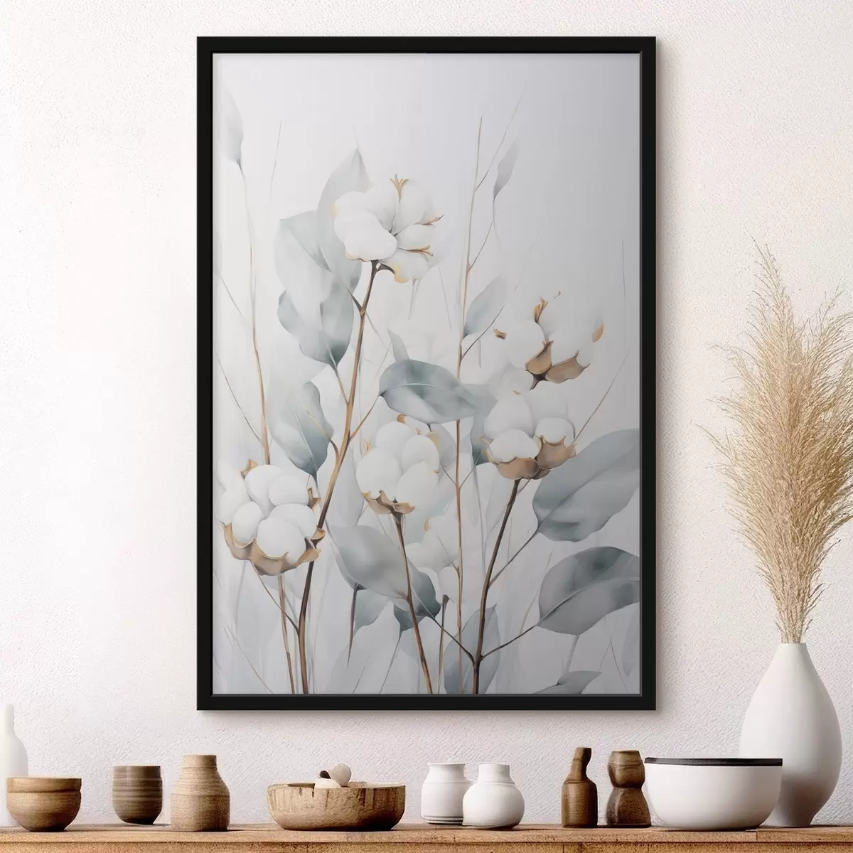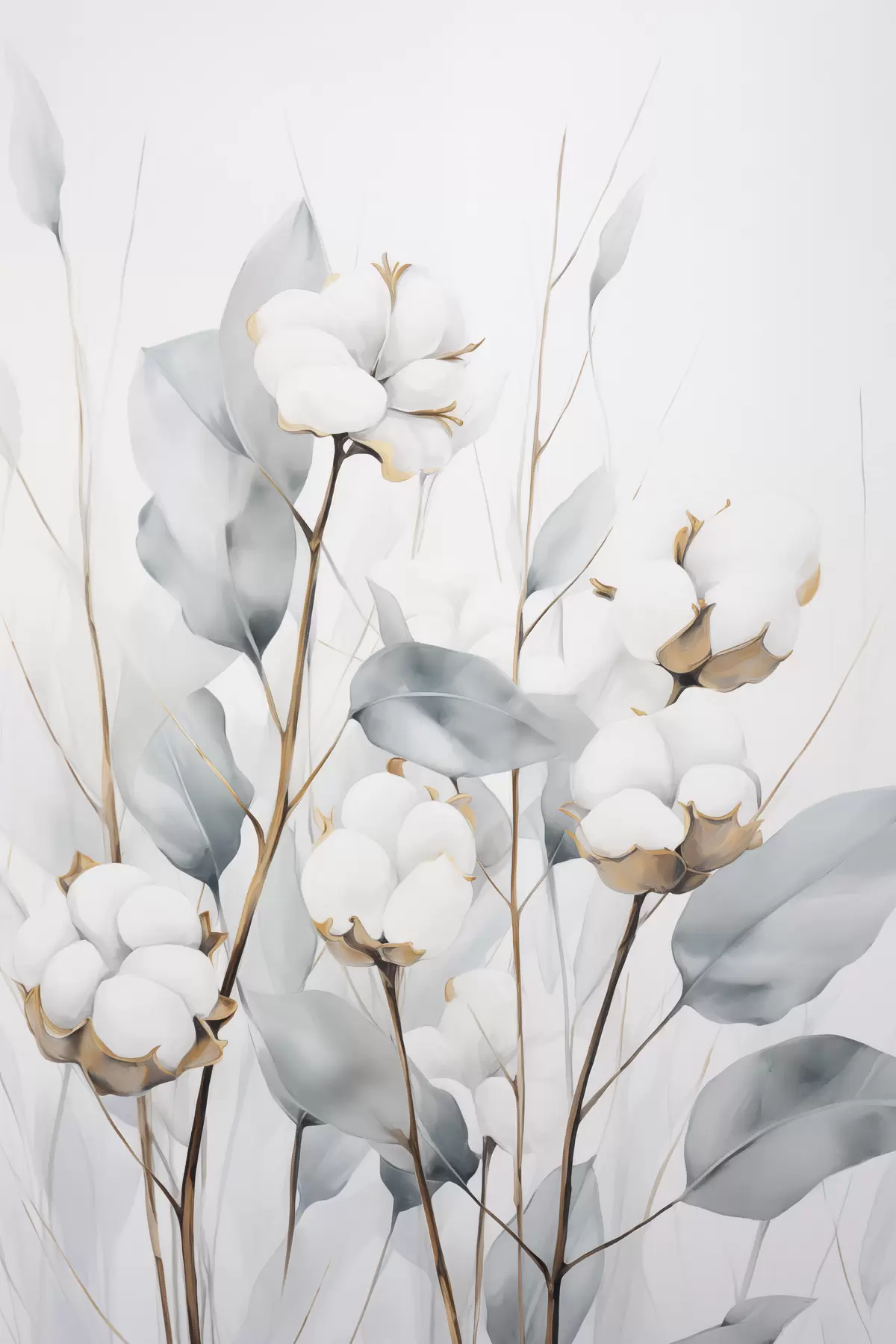Poster Eine weiße Baumwollpflanze mit hellblaugrünen Blättern vor einem hellen Hintergrund Nr f48743