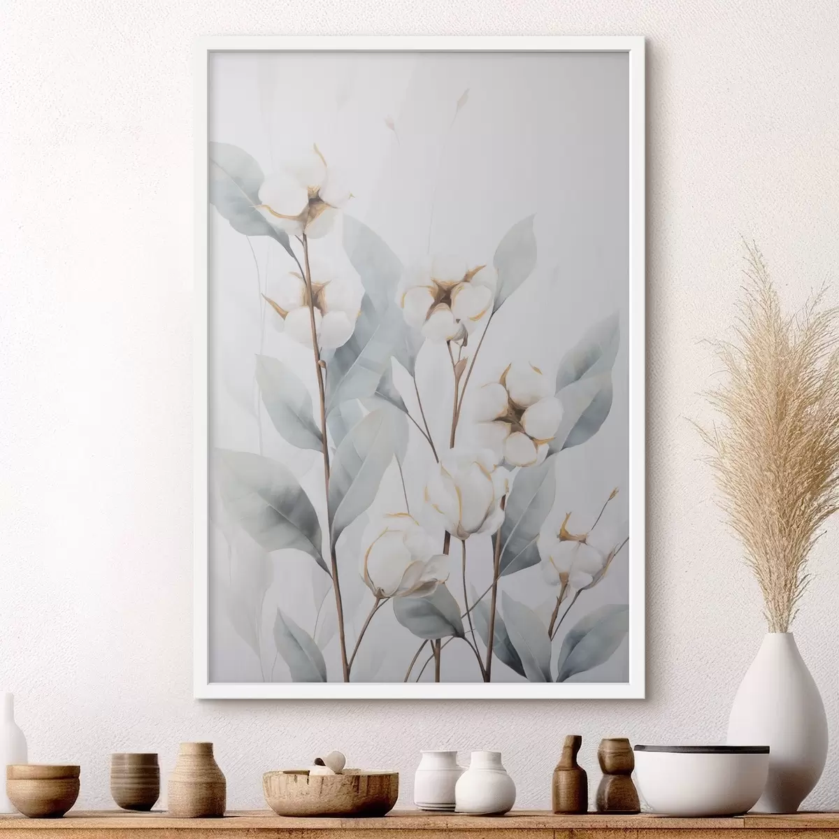 Poster Eine weiße Baumwollpflanze mit hellblaugrünen Blättern vor einem hellen Hintergrund Nr f48744