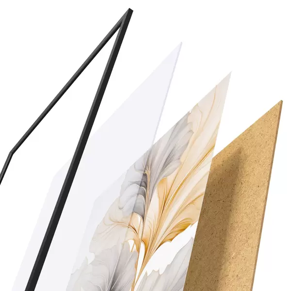 Das Poster besteht aus einem Rahmen, Plexiglas, einem gedruckten Bild und einer Rückwand aus Spanplatten. Dank der Halterungen auf der Rückseite kann das Poster sofort an die Wand gehängt werden.