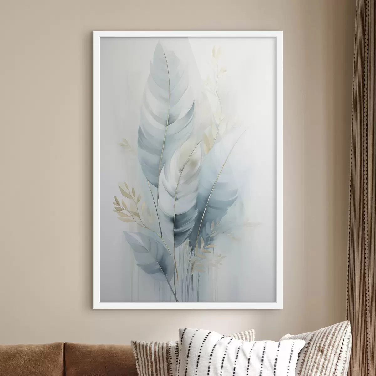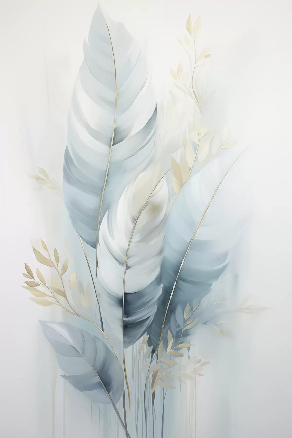 Poster Große, weiche Federn in Blau- und Weißtönen mit zarten beigen Blättern Nr f48749