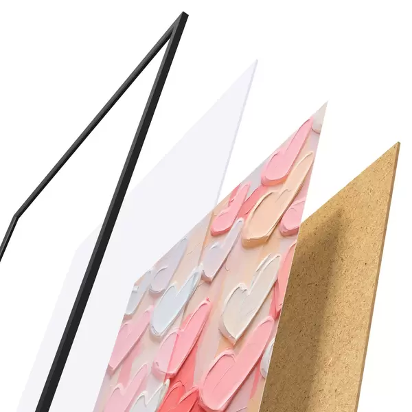 Das Poster besteht aus einem Rahmen, Plexiglas, einem gedruckten Bild und einer Rückwand aus Spanplatten. Dank der Halterungen auf der Rückseite kann das Poster sofort an die Wand gehängt werden.