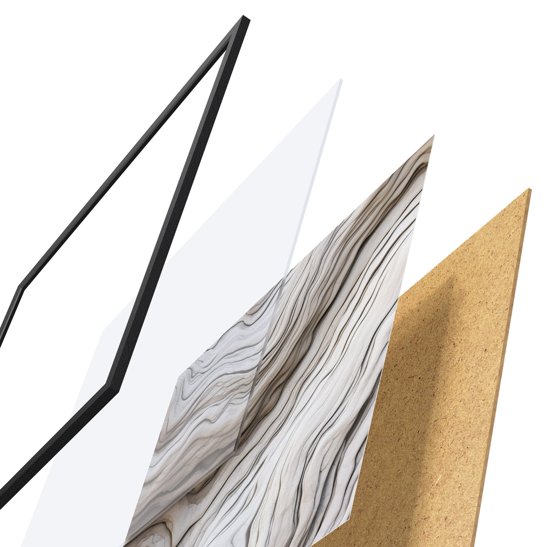Das Poster besteht aus einem Rahmen, Plexiglas, einem gedruckten Bild und einer Rückwand aus Spanplatten. Dank der Halterungen auf der Rückseite kann das Poster sofort an die Wand gehängt werden.