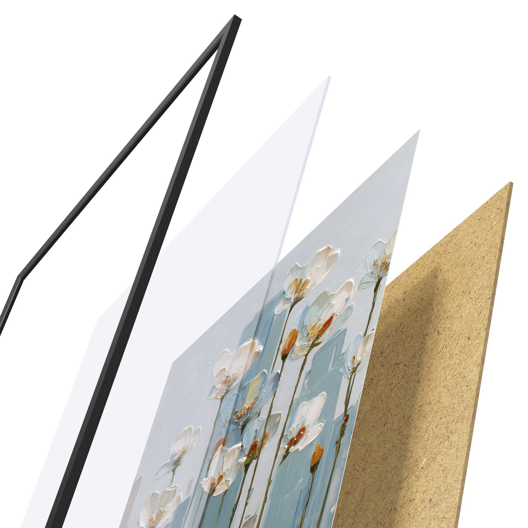Das Poster besteht aus einem Rahmen, Plexiglas, einem gedruckten Bild und einer Rückwand aus Spanplatten. Dank der Halterungen auf der Rückseite kann das Poster sofort an die Wand gehängt werden.
