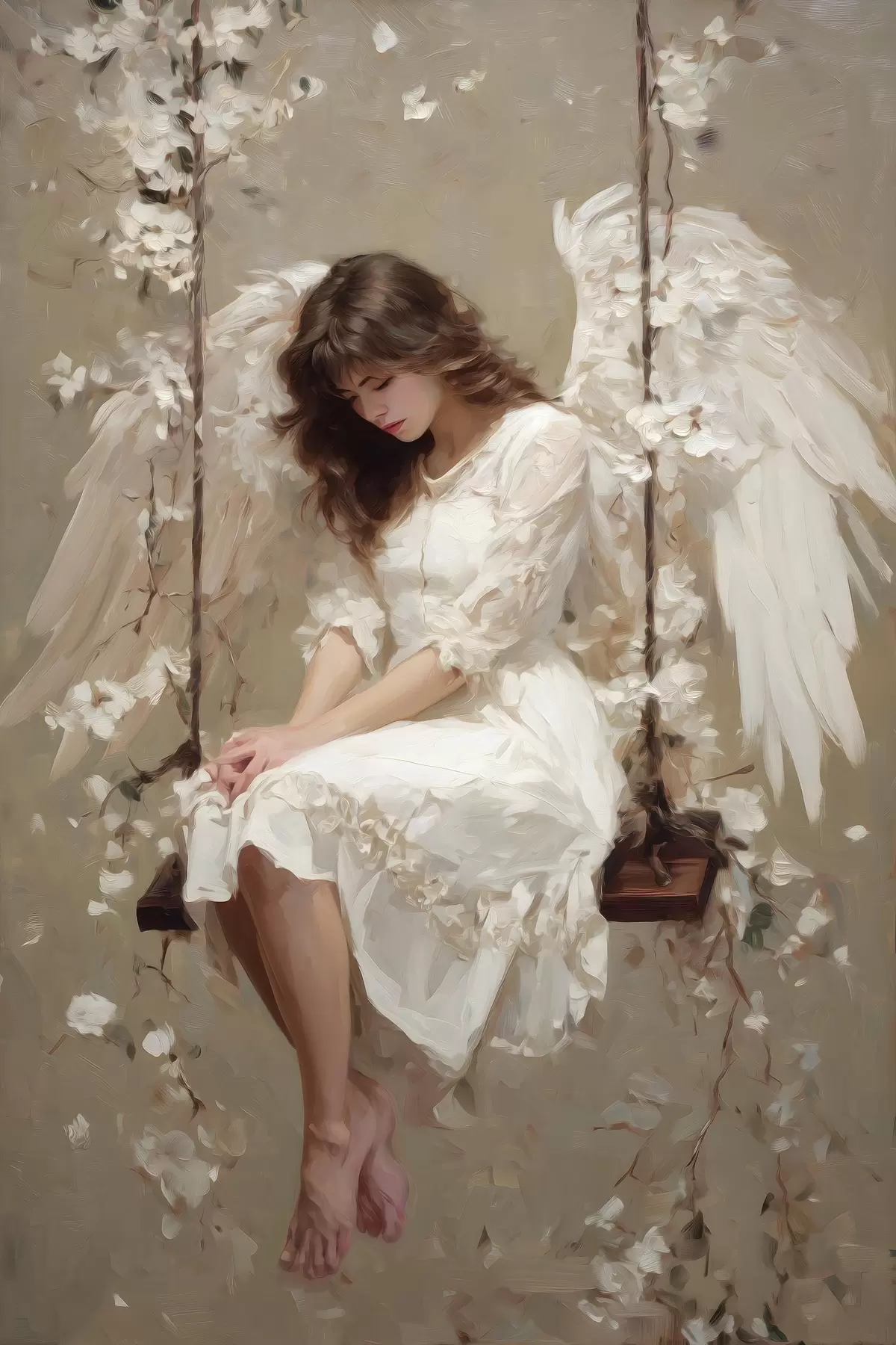 Poster ein Engel-Mädchen auf einer Schaukel, im Ölstil gemalt f48789