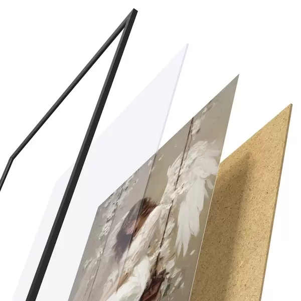 Das Poster besteht aus einem Rahmen, Plexiglas, einem gedruckten Bild und einer Rückwand aus Spanplatten. Dank der Halterungen auf der Rückseite kann das Poster sofort an die Wand gehängt werden.