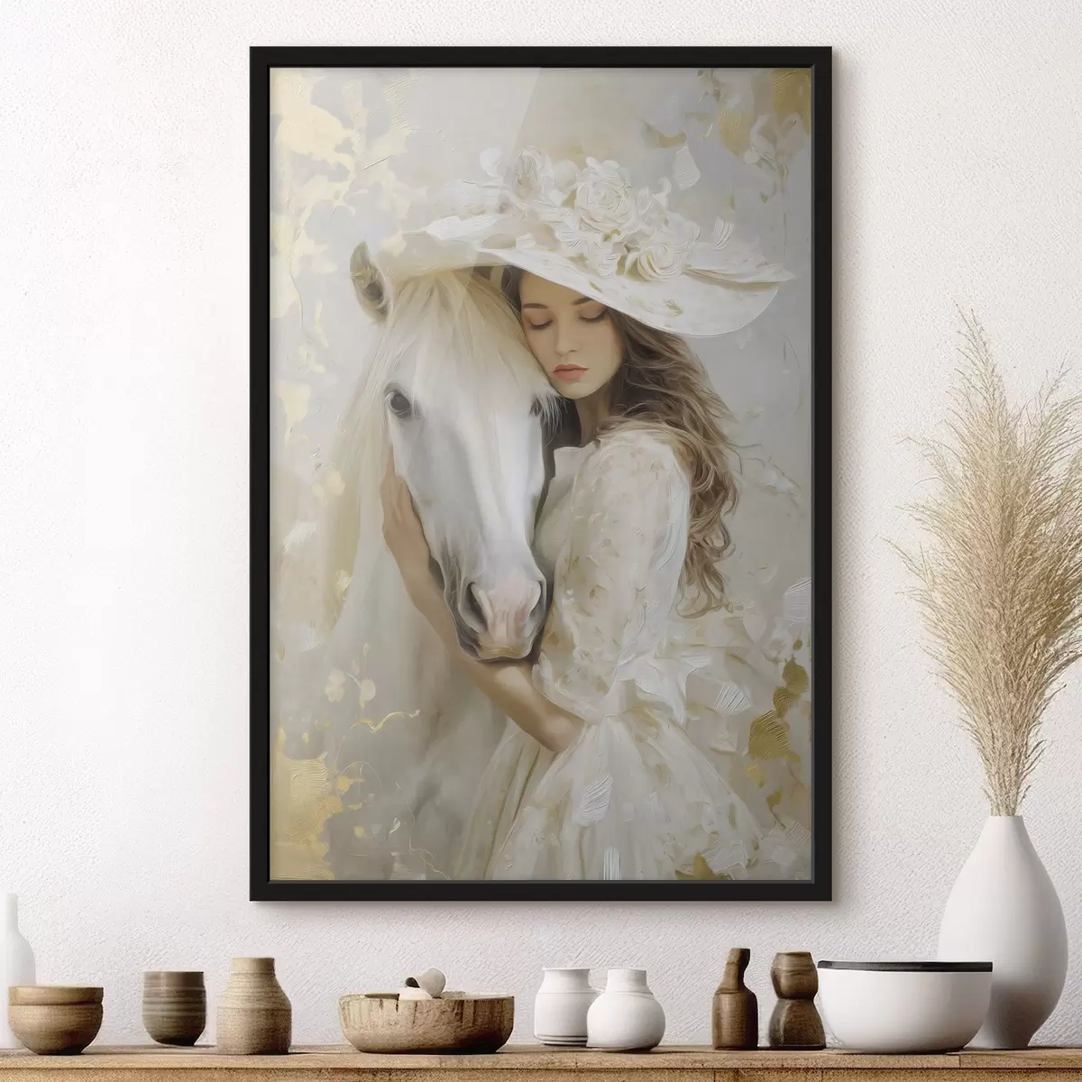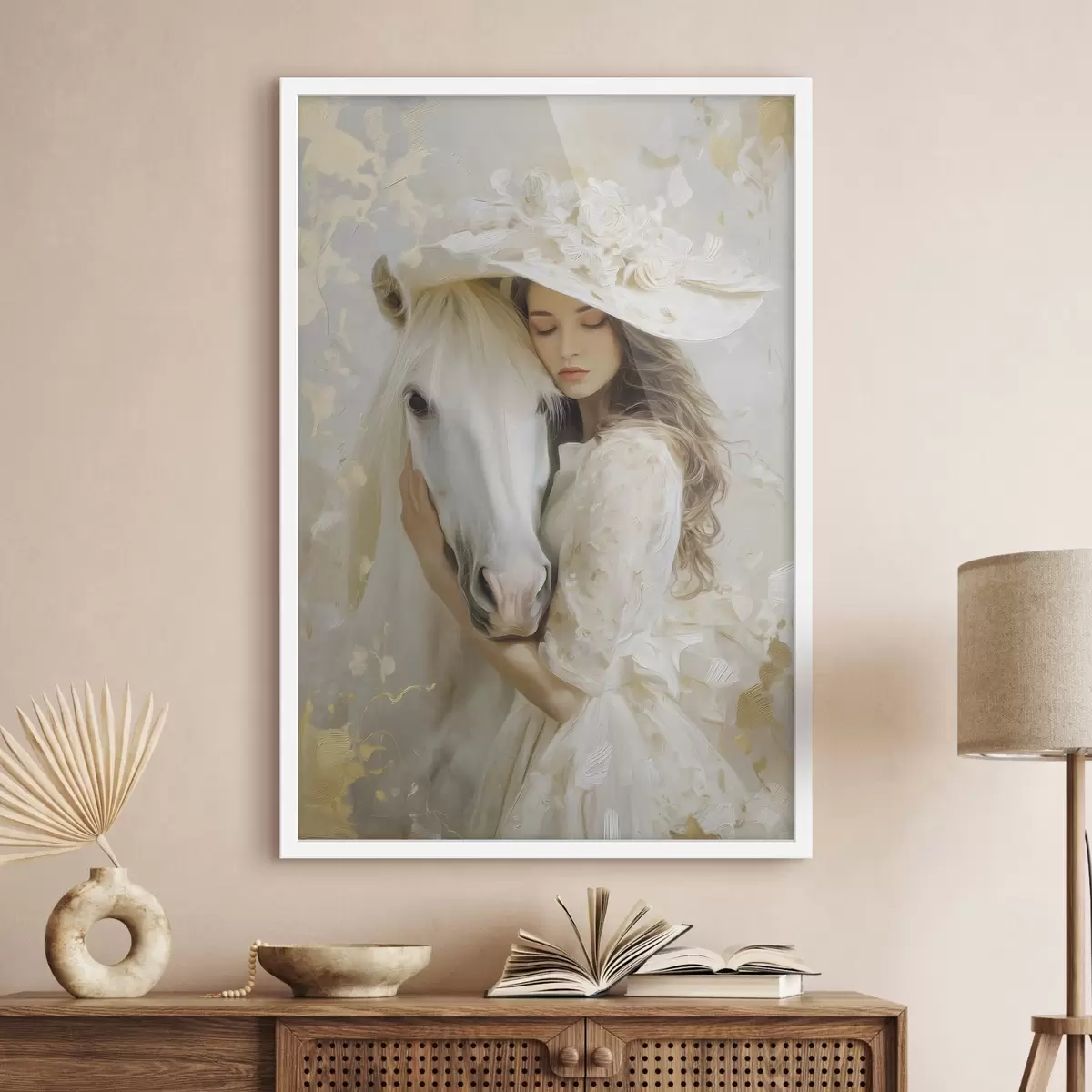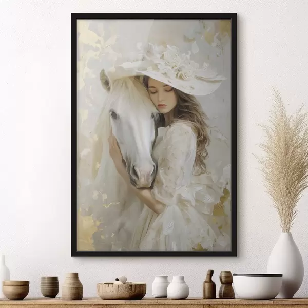 Poster ein Mädchen mit einem weißen Pferd, im Ölstil gemalt Nr f48790