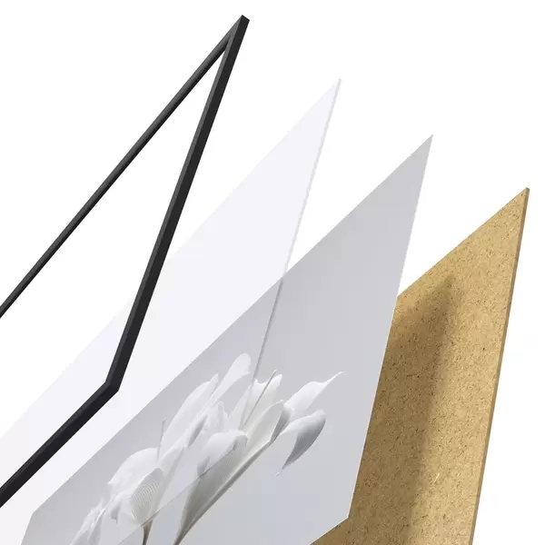Das Poster besteht aus einem Rahmen, Plexiglas, einem gedruckten Bild und einer Rückwand aus Spanplatten. Dank der Halterungen auf der Rückseite kann das Poster sofort an die Wand gehängt werden.