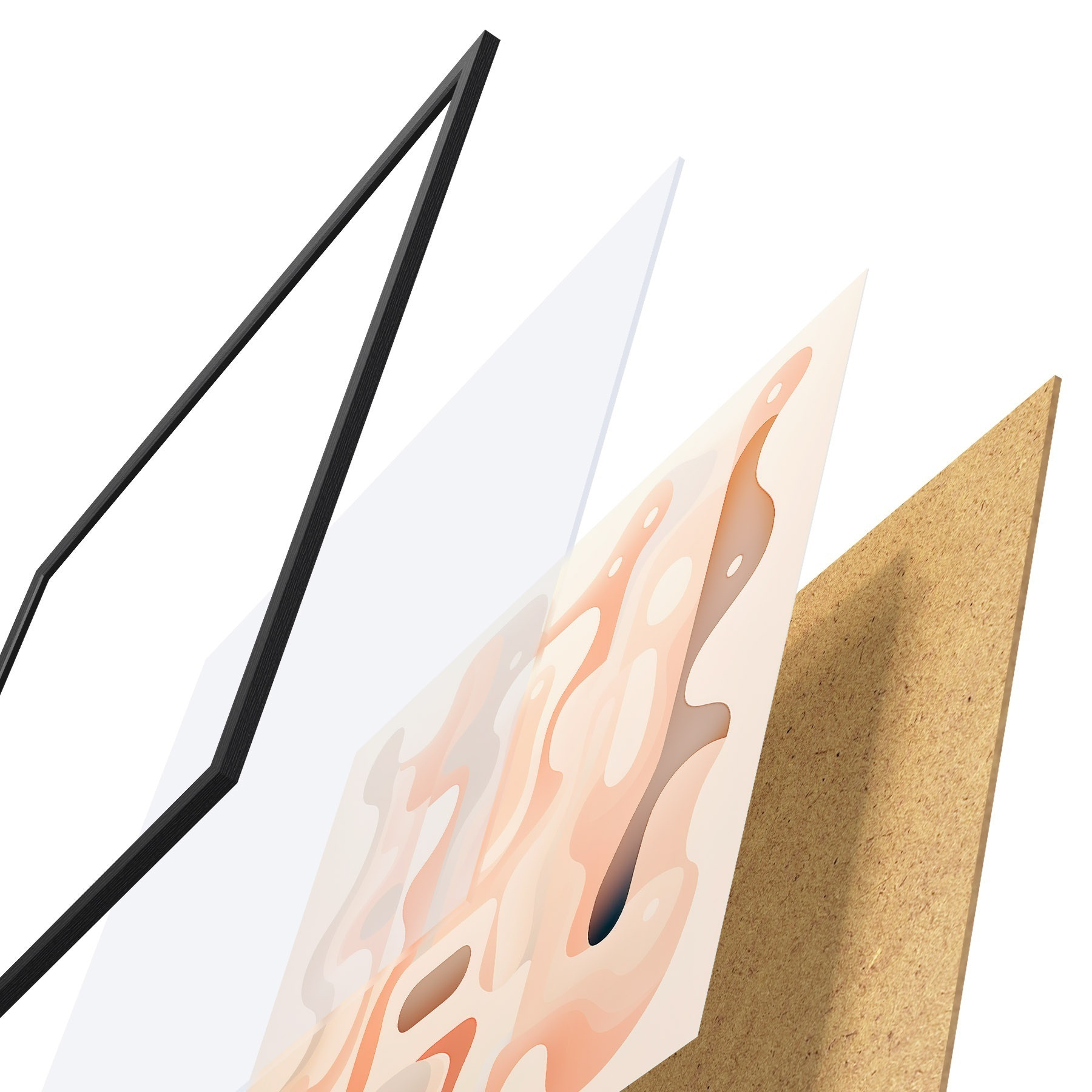 Das Poster besteht aus einem Rahmen, Plexiglas, einem gedruckten Bild und einer Rückwand aus Spanplatten. Dank der Halterungen auf der Rückseite kann das Poster sofort an die Wand gehängt werden.