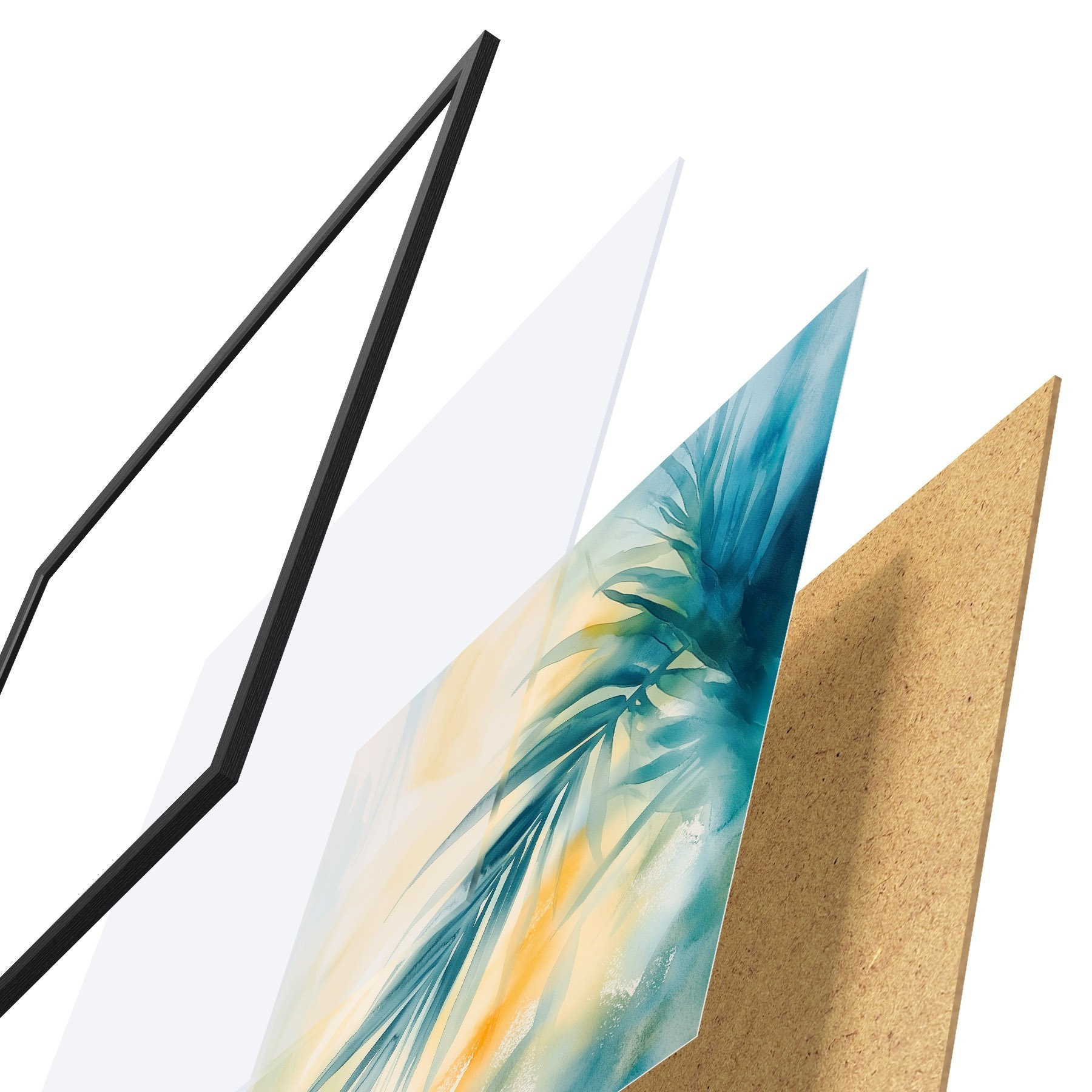 Poster Tropische Palmblätter in Blau- und Türkistönen vor einem Hintergrund aus warmen Aquarellflecken Nr f48849