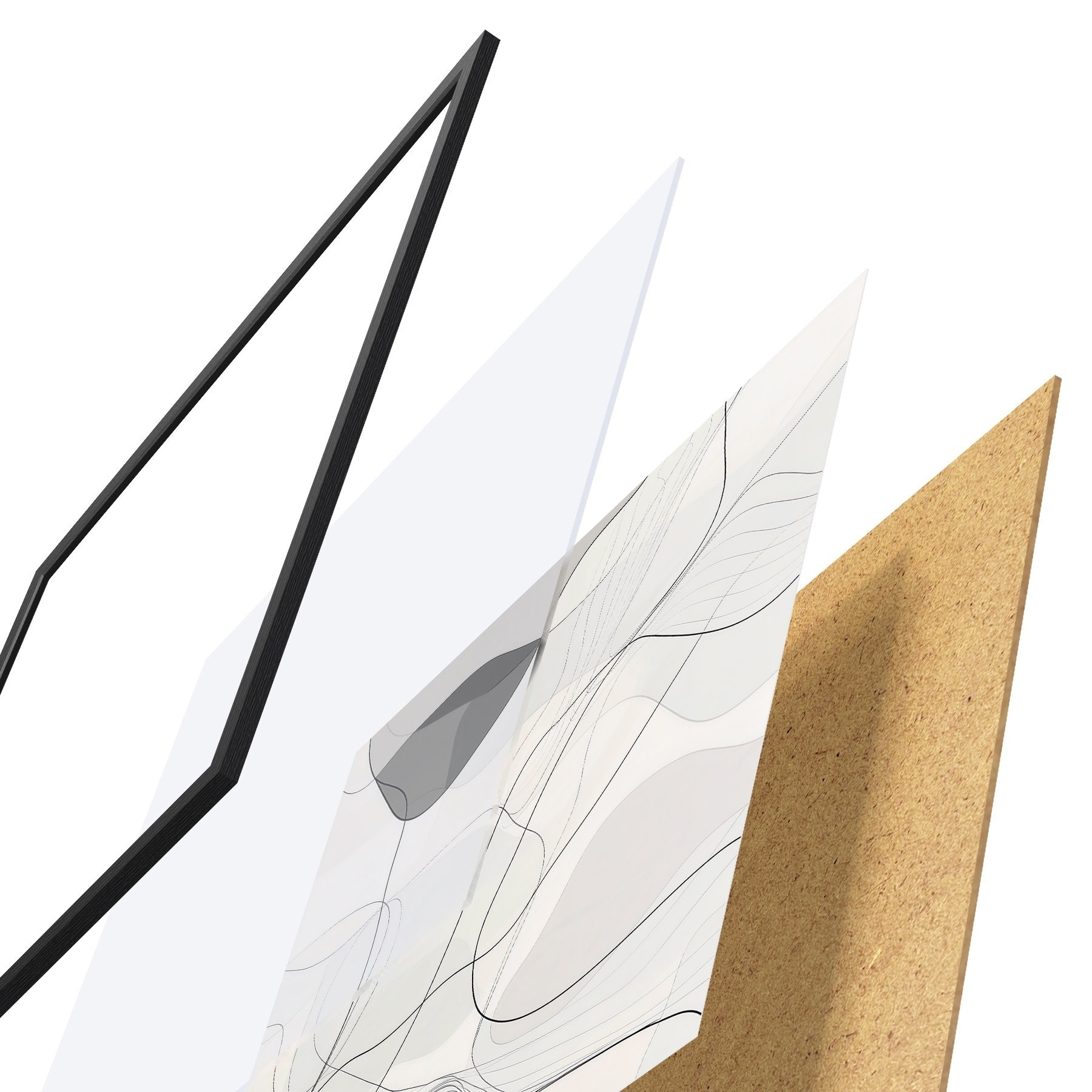 Das Poster besteht aus einem Rahmen, Plexiglas, einem gedruckten Bild und einer Rückwand aus Spanplatten. Dank der Halterungen auf der Rückseite kann das Poster sofort an die Wand gehängt werden.