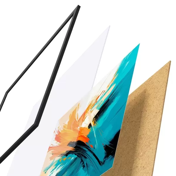 Das Poster besteht aus einem Rahmen, Plexiglas, einem gedruckten Bild und einer Rückwand aus Spanplatten. Dank der Halterungen auf der Rückseite kann das Poster sofort an die Wand gehängt werden.