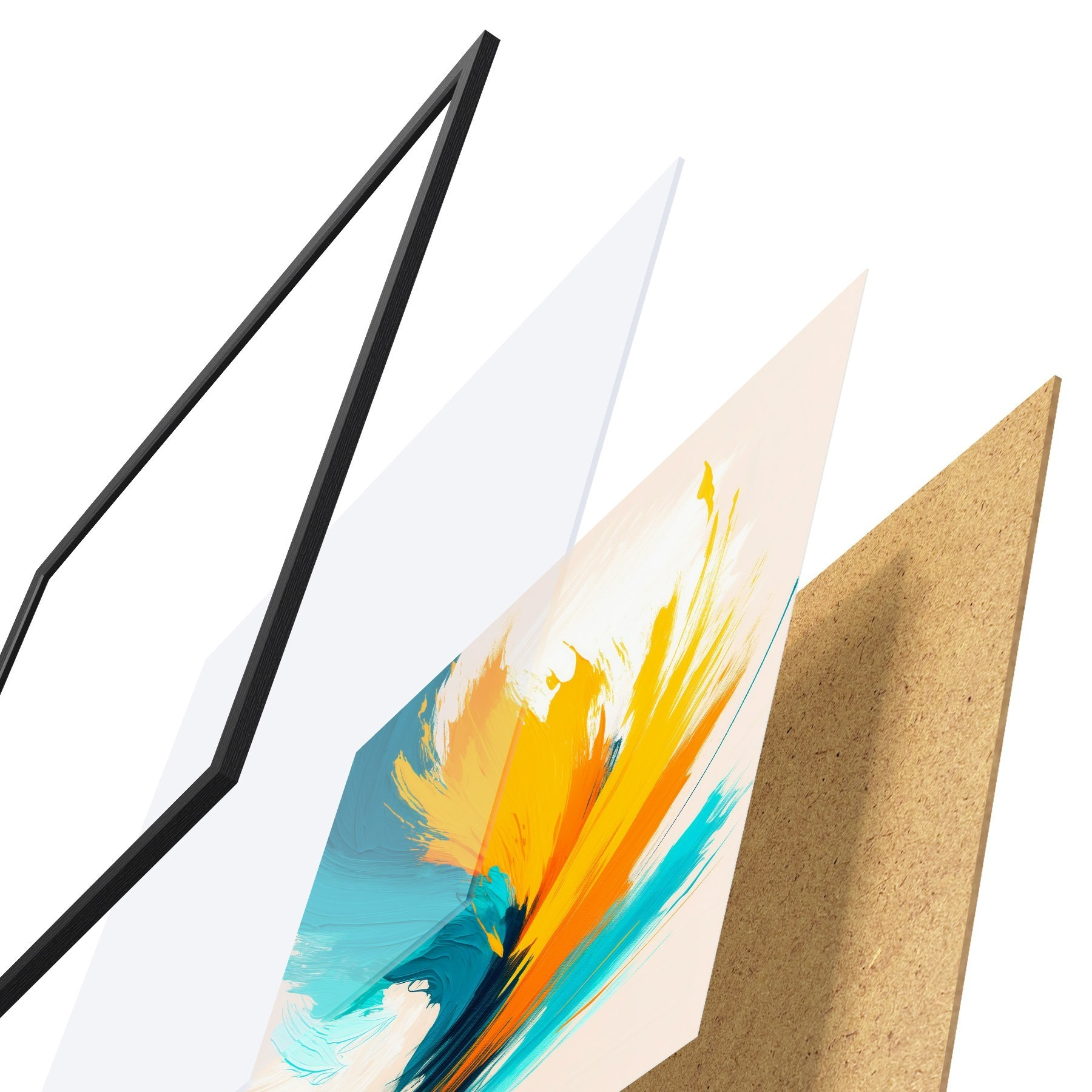 Das Poster besteht aus einem Rahmen, Plexiglas, einem gedruckten Bild und einer Rückwand aus Spanplatten. Dank der Halterungen auf der Rückseite kann das Poster sofort an die Wand gehängt werden.
