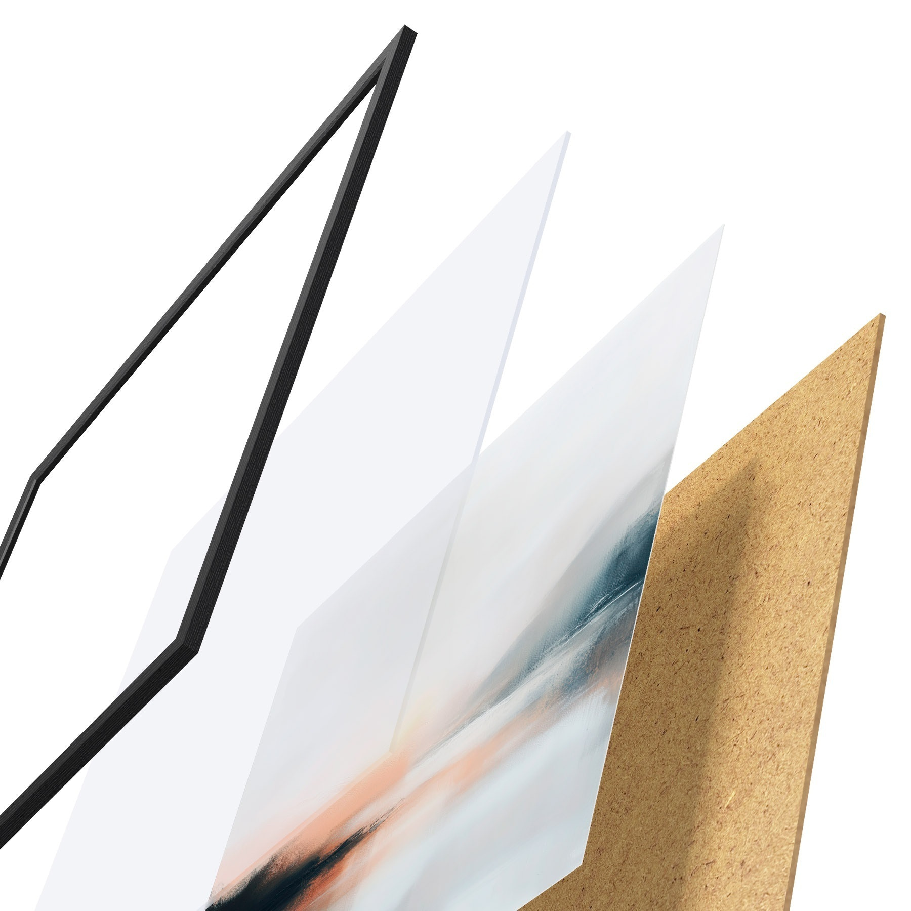 Das Poster besteht aus einem Rahmen, Plexiglas, einem gedruckten Bild und einer Rückwand aus Spanplatten. Dank der Halterungen auf der Rückseite kann das Poster sofort an die Wand gehängt werden.