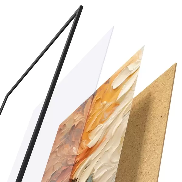 Das Poster besteht aus einem Rahmen, Plexiglas, einem gedruckten Bild und einer Rückwand aus Spanplatten. Dank der Halterungen auf der Rückseite kann das Poster sofort an die Wand gehängt werden.