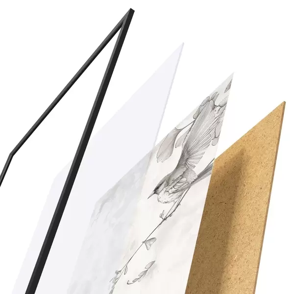 Das Poster besteht aus einem Rahmen, Plexiglas, einem gedruckten Bild und einer Rückwand aus Spanplatten. Dank der Halterungen auf der Rückseite kann das Poster sofort an die Wand gehängt werden.