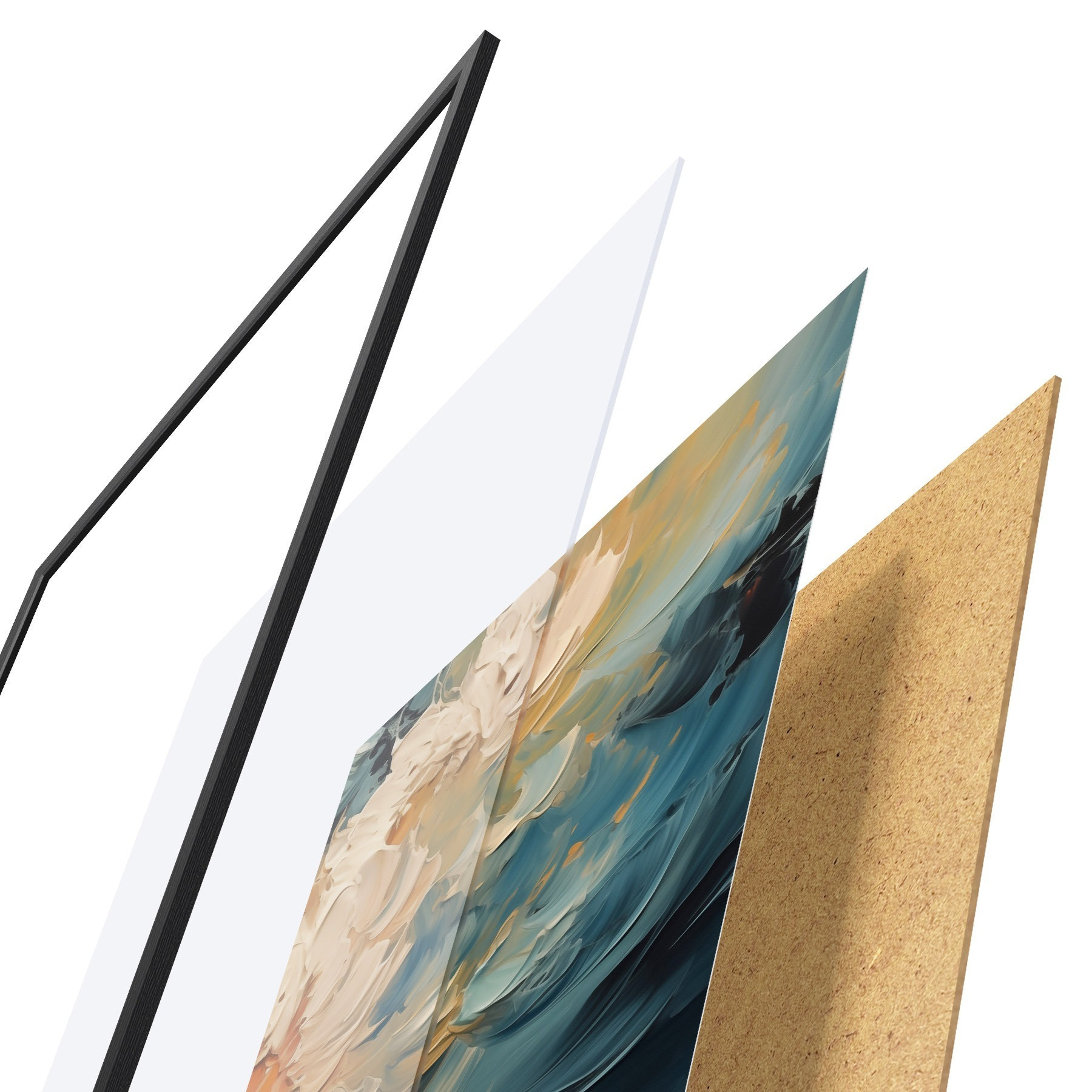 Das Poster besteht aus einem Rahmen, Plexiglas, einem gedruckten Bild und einer Rückwand aus Spanplatten. Dank der Halterungen auf der Rückseite kann das Poster sofort an die Wand gehängt werden.
