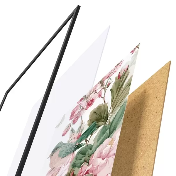 Das Poster besteht aus einem Rahmen, Plexiglas, einem gedruckten Bild und einer Rückwand aus Spanplatten. Dank der Halterungen auf der Rückseite kann das Poster sofort an die Wand gehängt werden.