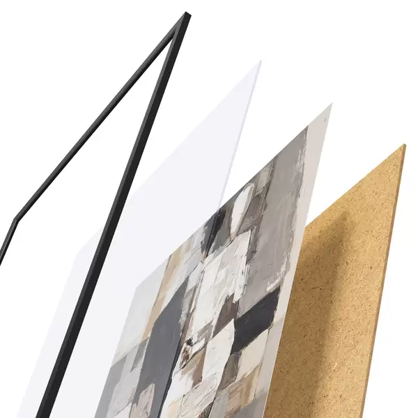 Das Poster besteht aus einem Rahmen, Plexiglas, einem gedruckten Bild und einer Rückwand aus Spanplatten. Dank der Halterungen auf der Rückseite kann das Poster sofort an die Wand gehängt werden.