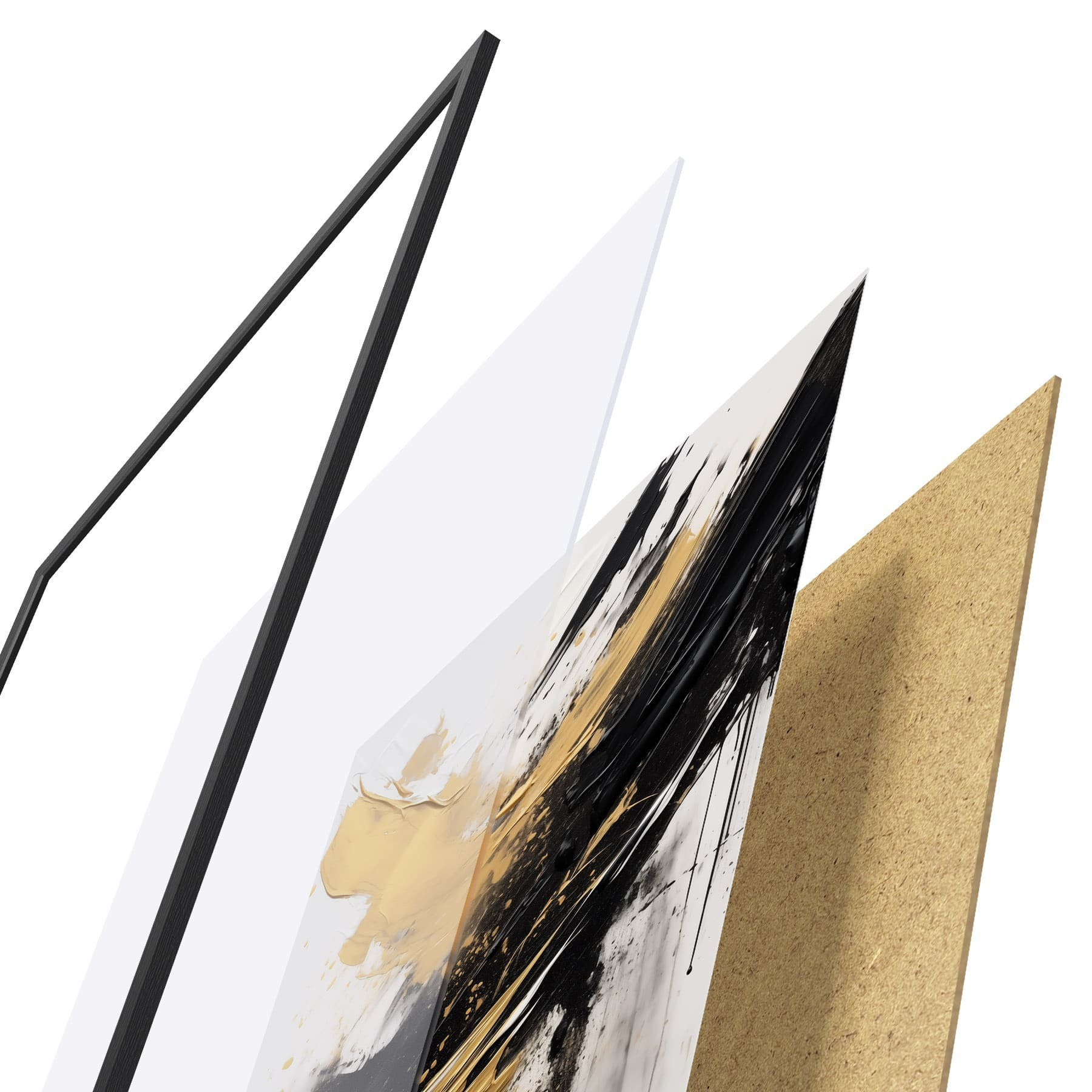 Das Poster besteht aus einem Rahmen, Plexiglas, einem gedruckten Bild und einer Rückwand aus Spanplatten. Dank der Halterungen auf der Rückseite kann das Poster sofort an die Wand gehängt werden.