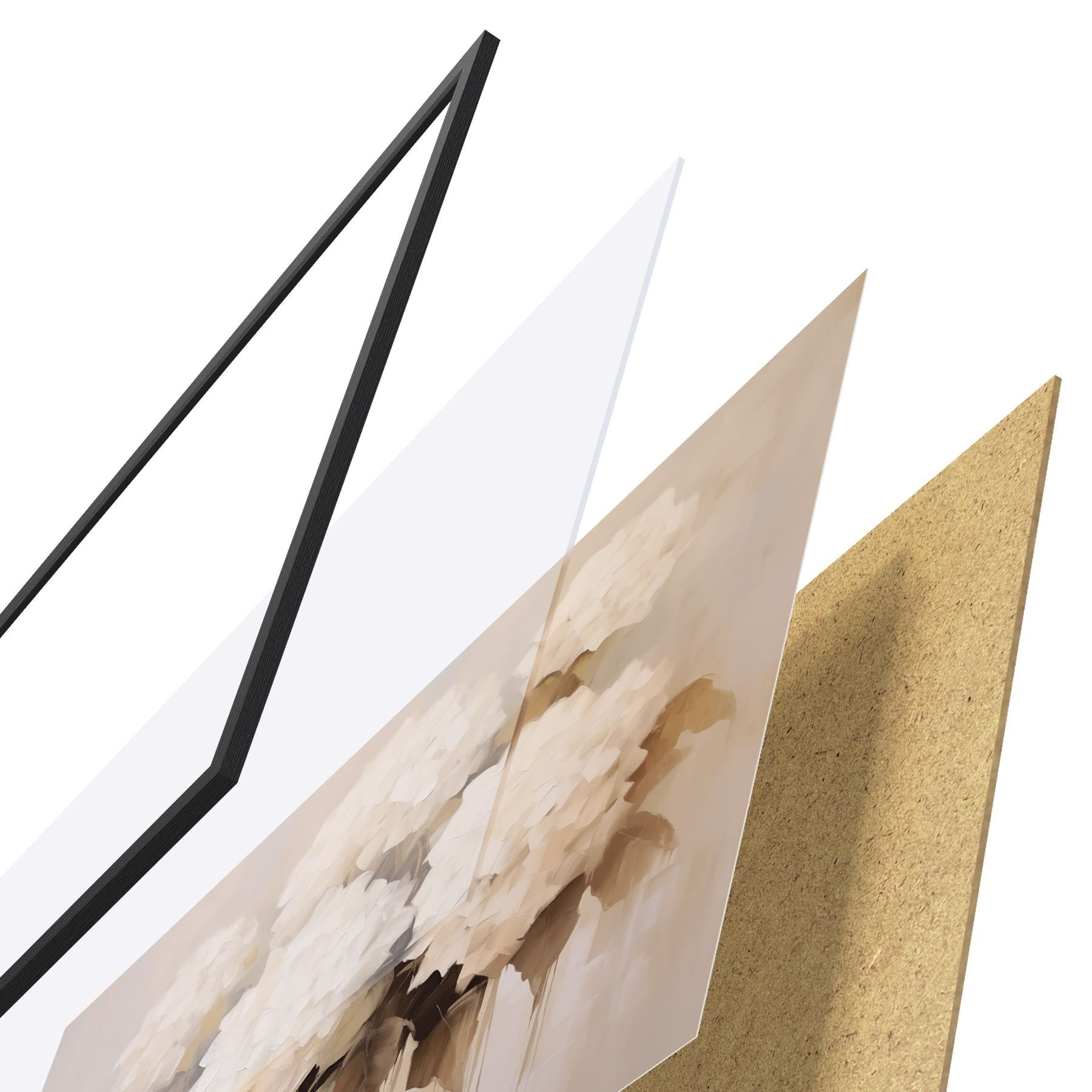 Das Poster besteht aus einem Rahmen, Plexiglas, einem gedruckten Bild und einer Rückwand aus Spanplatten. Dank der Halterungen auf der Rückseite kann das Poster sofort an die Wand gehängt werden.
