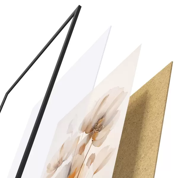 Das Poster besteht aus einem Rahmen, Plexiglas, einem gedruckten Bild und einer Rückwand aus Spanplatten. Dank der Halterungen auf der Rückseite kann das Poster sofort an die Wand gehängt werden.