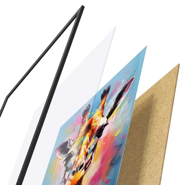 Das Poster besteht aus einem Rahmen, Plexiglas, einem gedruckten Bild und einer Rückwand aus Spanplatten. Dank der Halterungen auf der Rückseite kann das Poster sofort an die Wand gehängt werden.