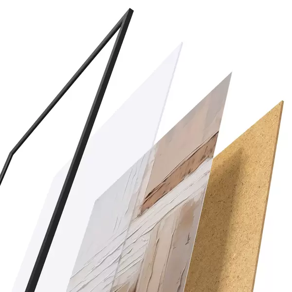Das Poster besteht aus einem Rahmen, Plexiglas, einem gedruckten Bild und einer Rückwand aus Spanplatten. Dank der Halterungen auf der Rückseite kann das Poster sofort an die Wand gehängt werden.